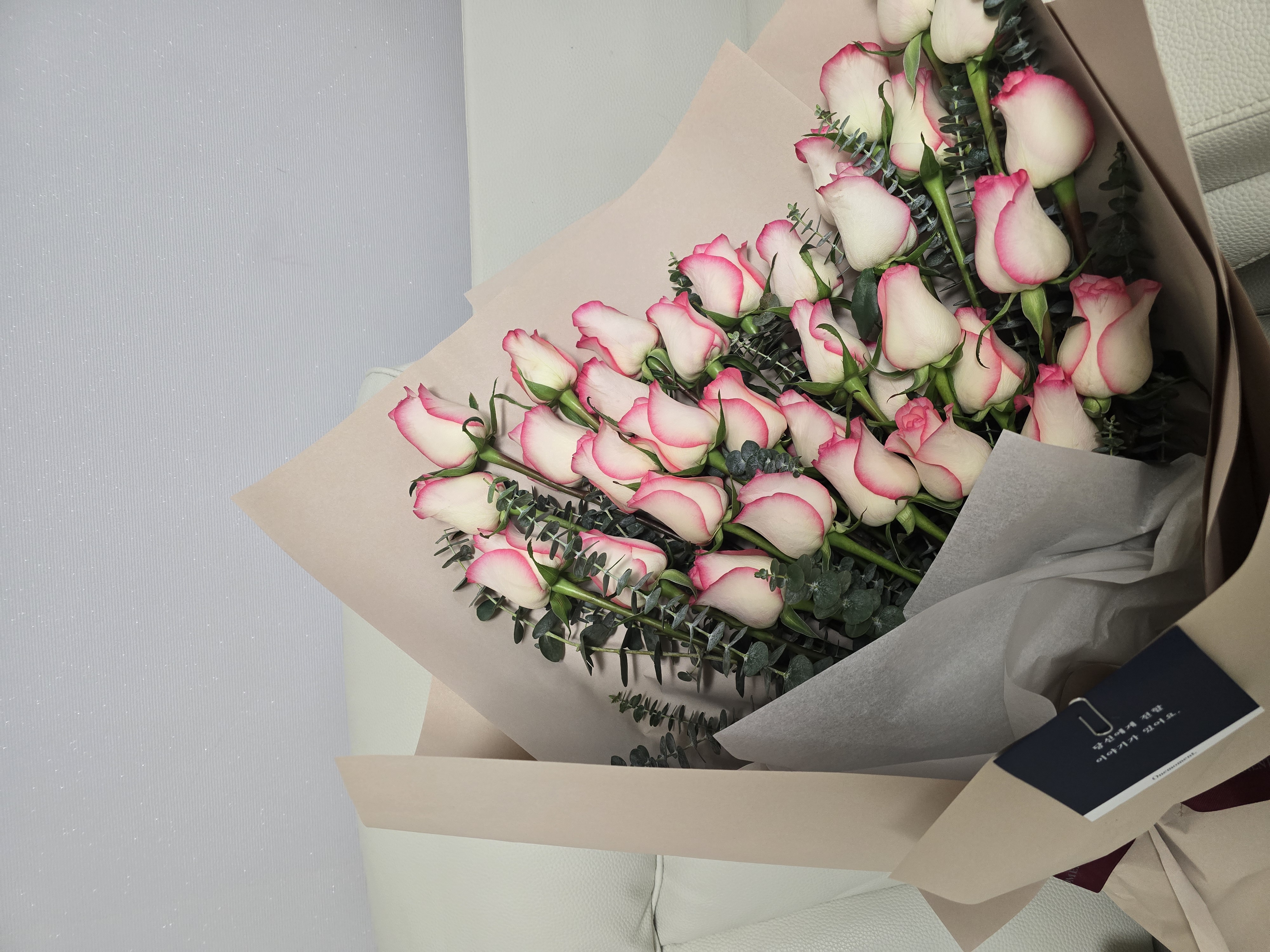 투톤 조합이 색다른 '스위트니스' 장미로 제작한 대형 꽃다발입니다.