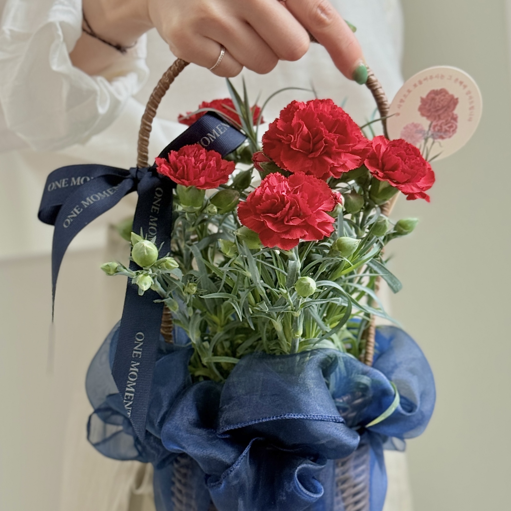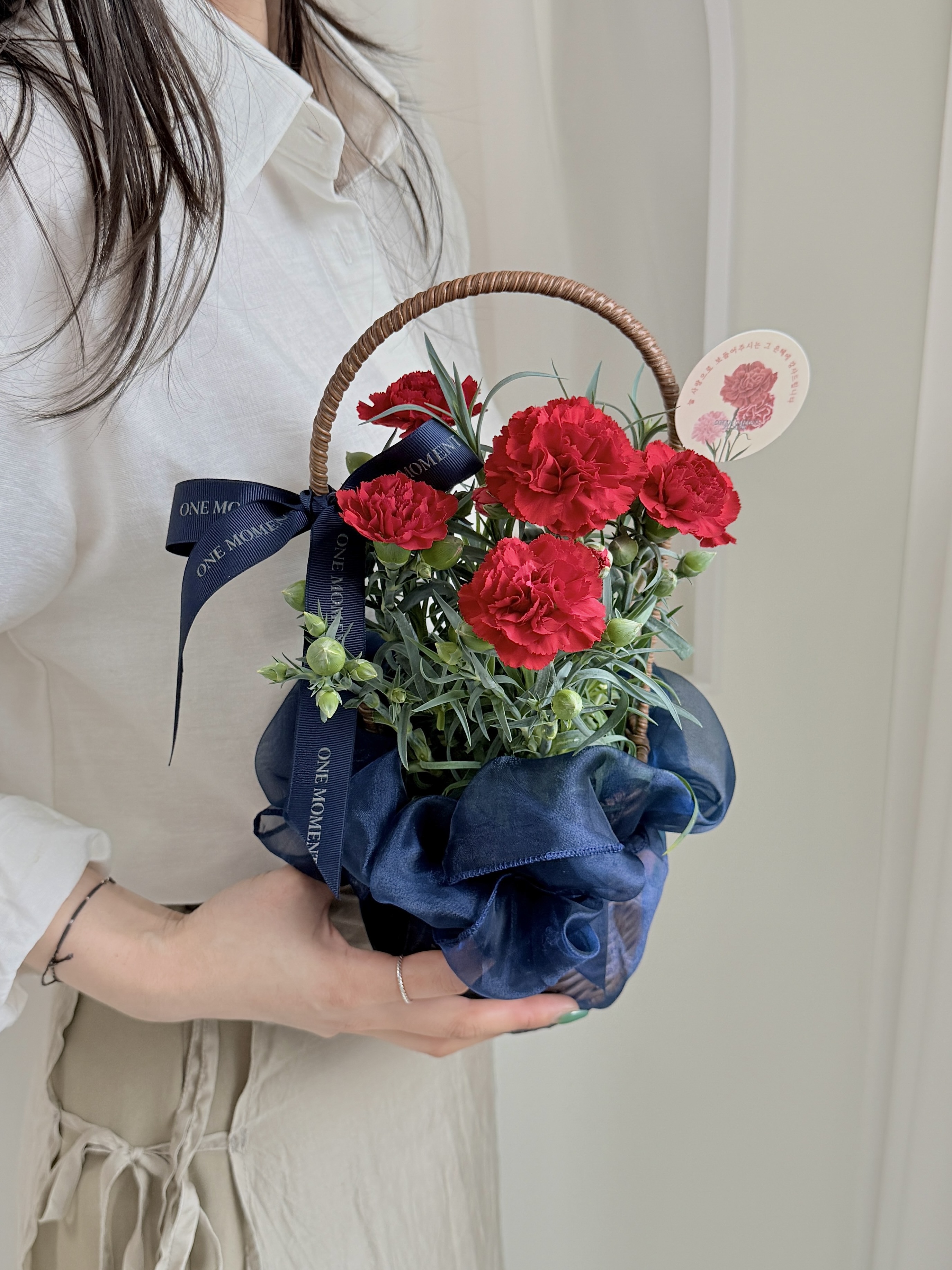 고급스러운 네이비 보자기로 포장한 레드 카네이션 화분과