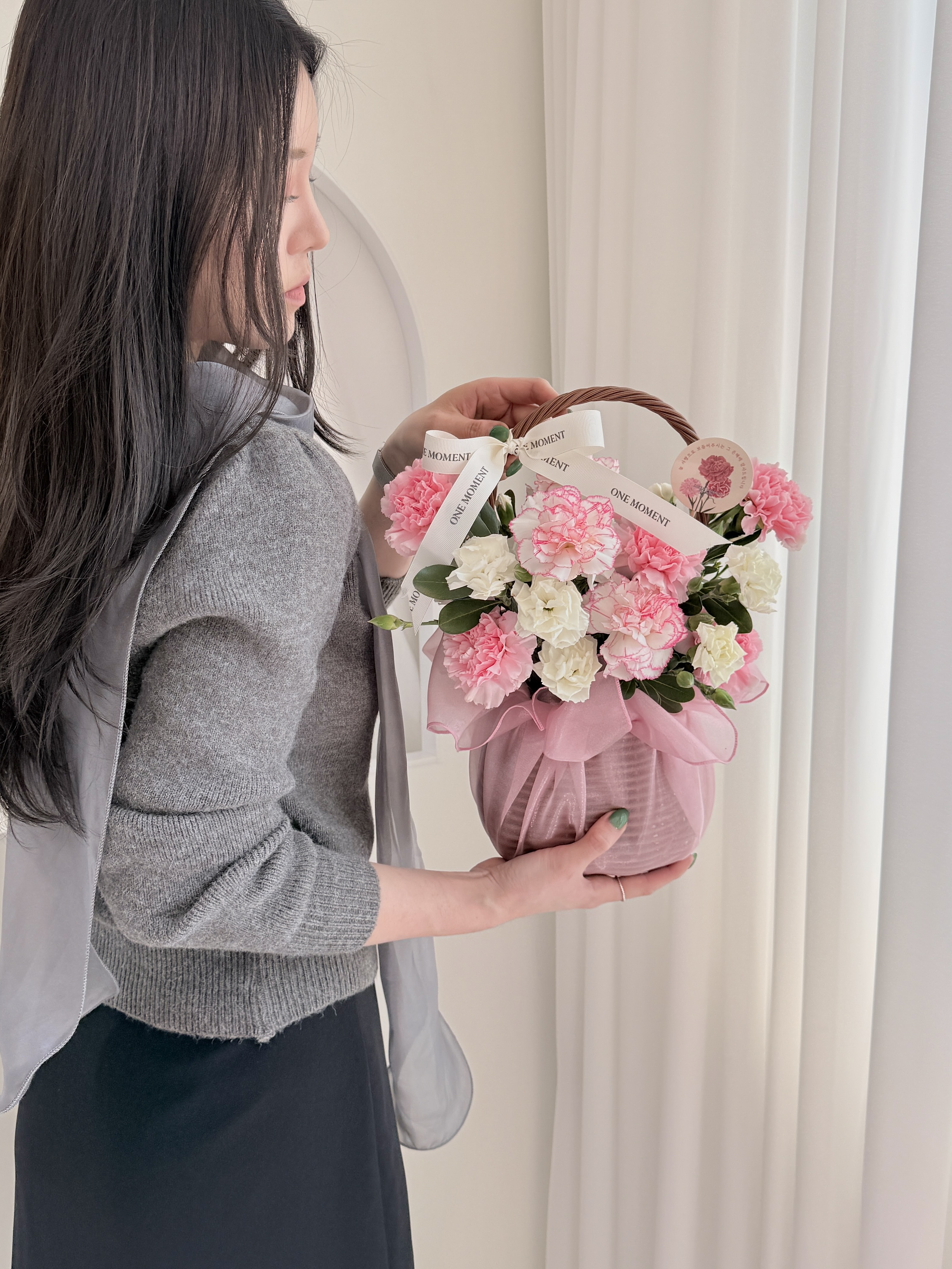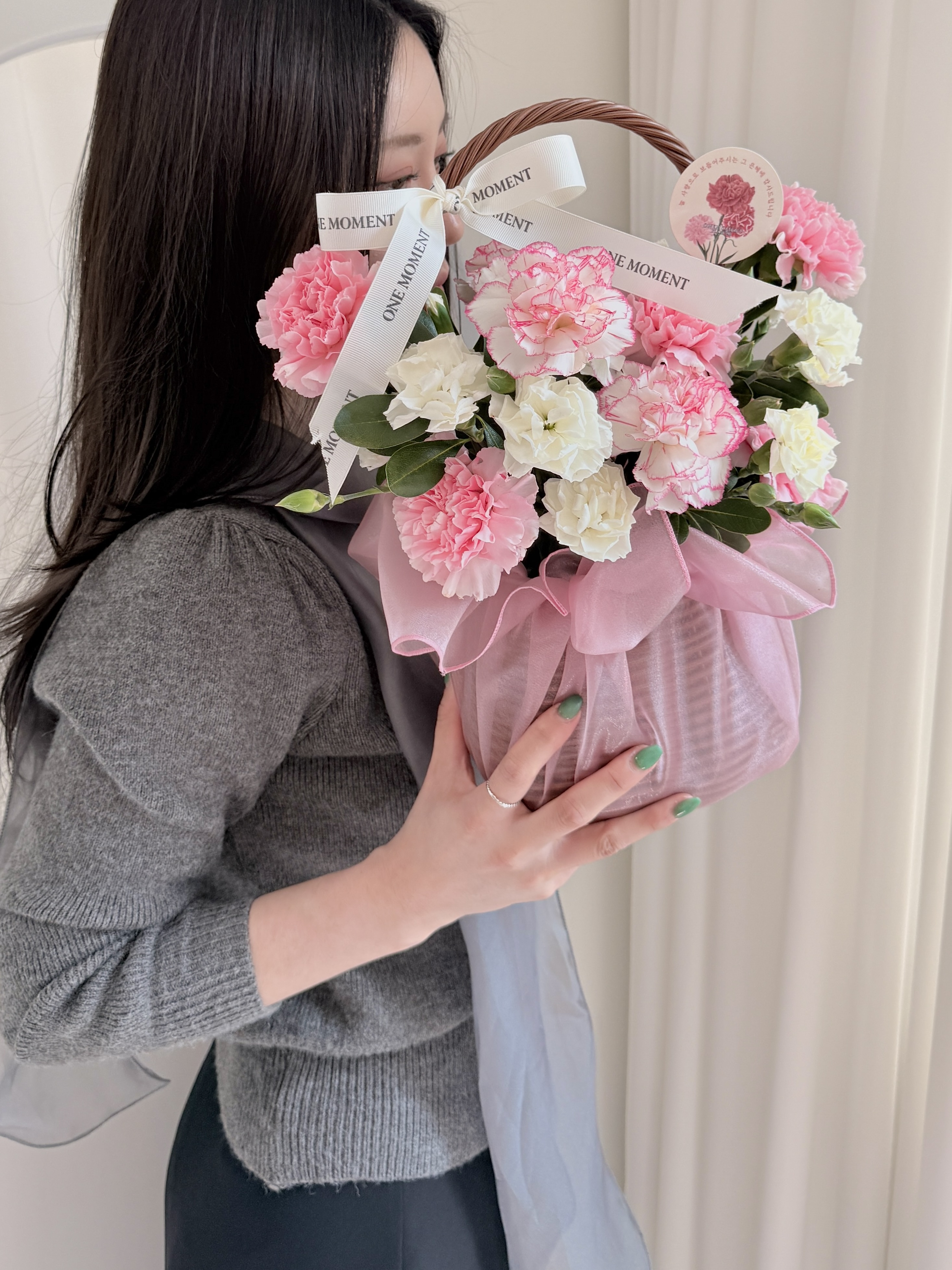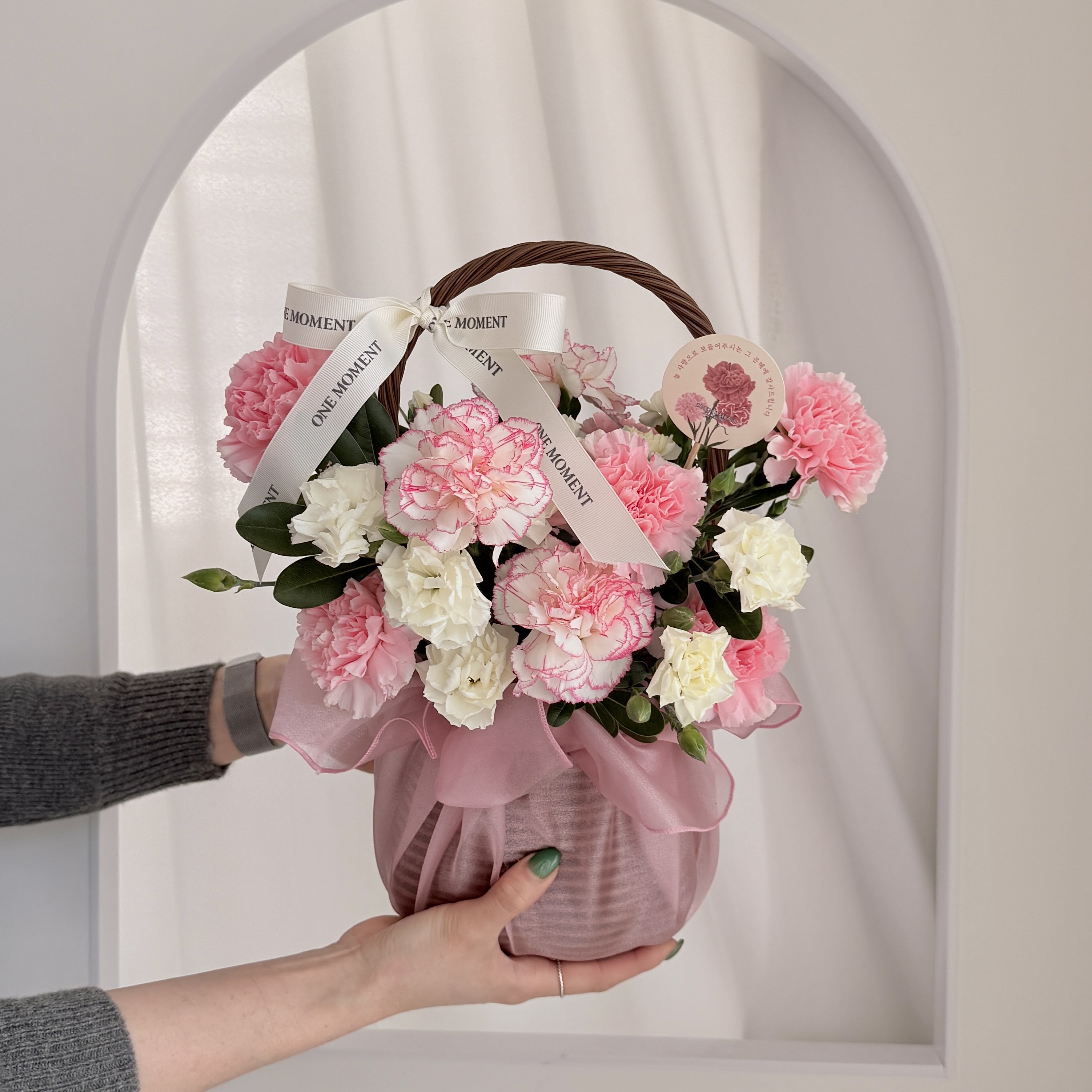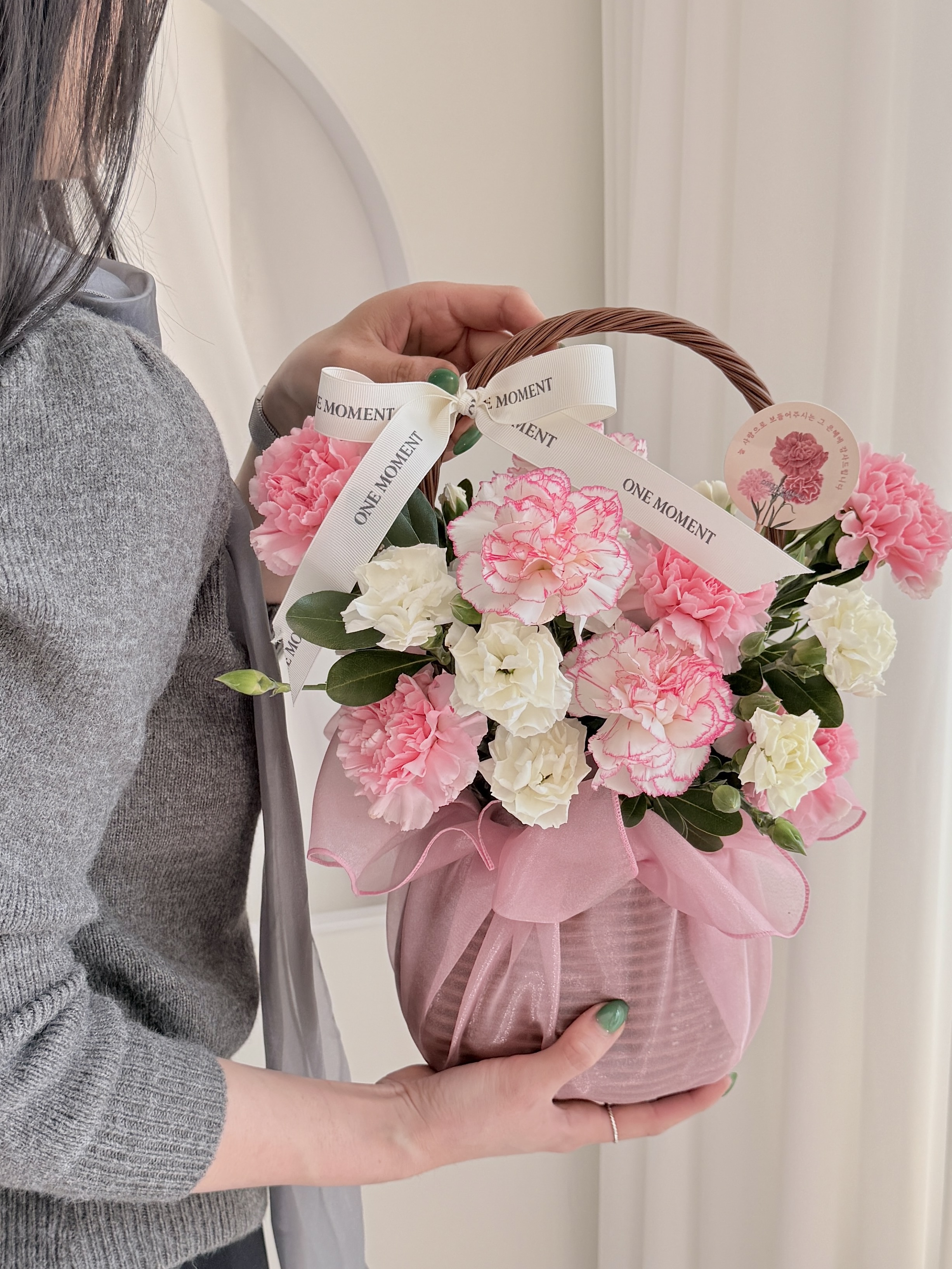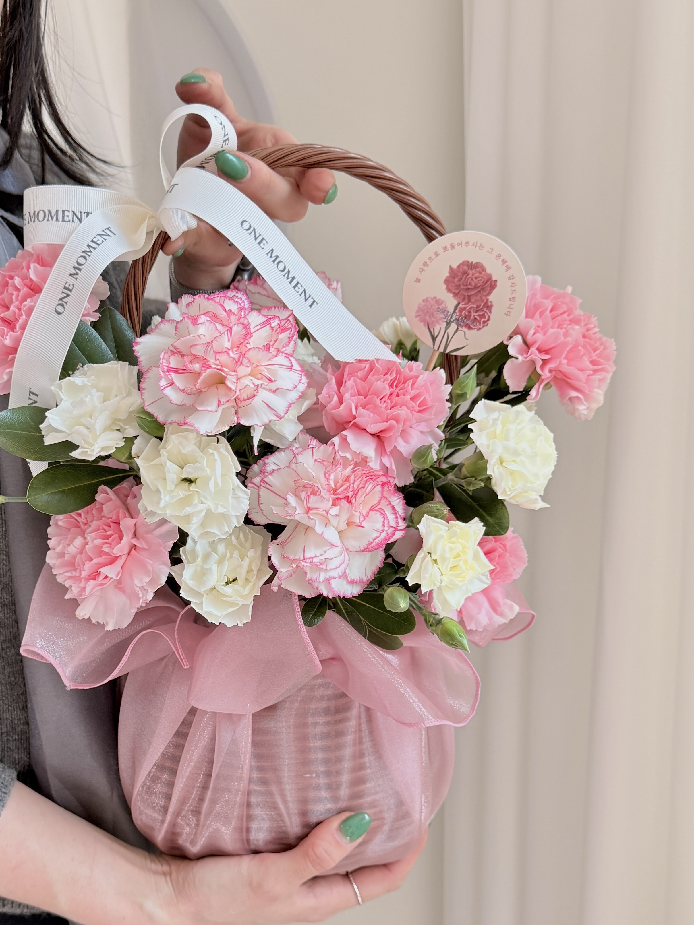 풍성한 카네이션과 리본 디테일, 감성적인 바스켓 디자인으로