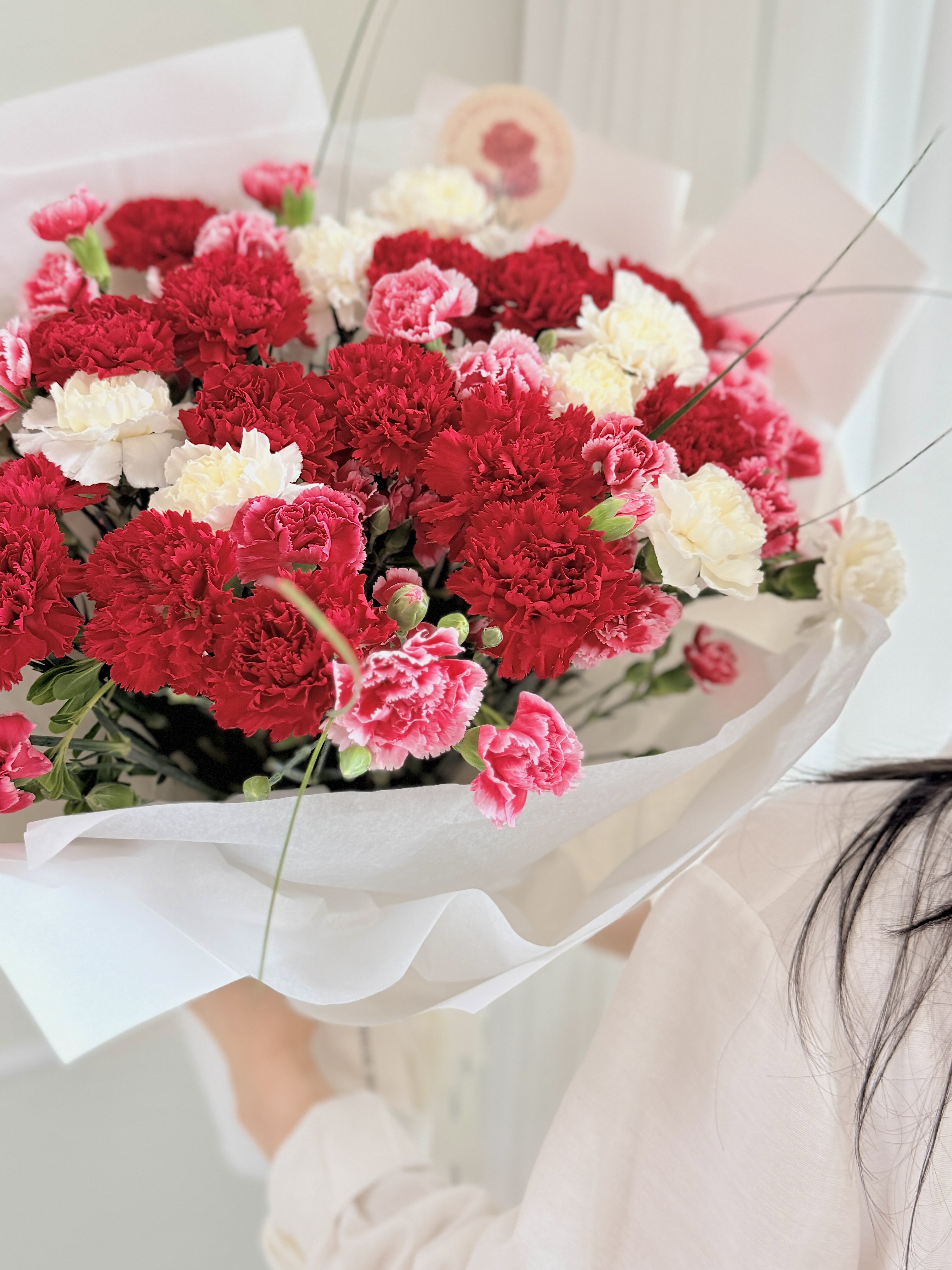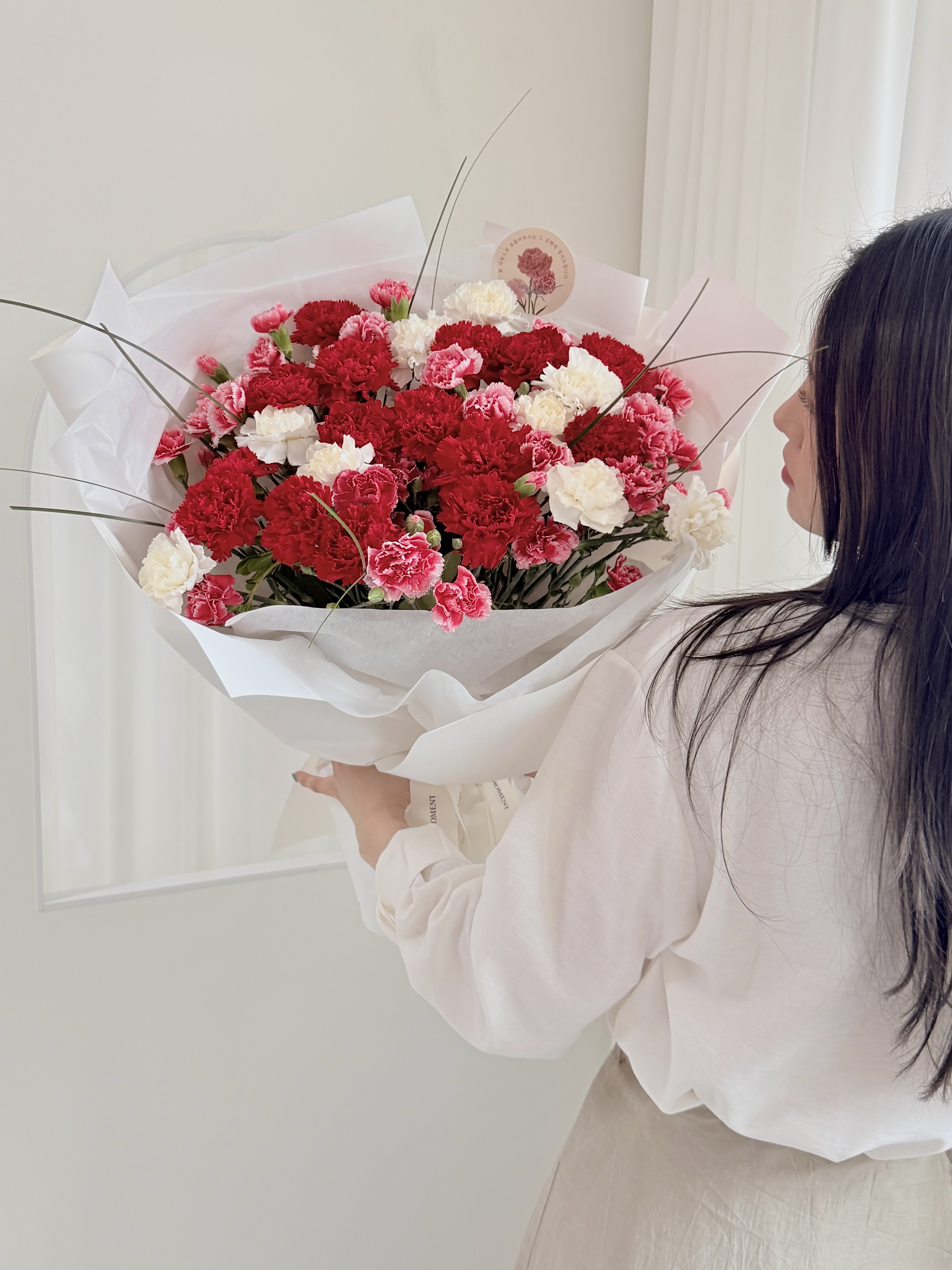레드 카네이션과 투톤 레드 카네이션을 풍성하게 담아낸