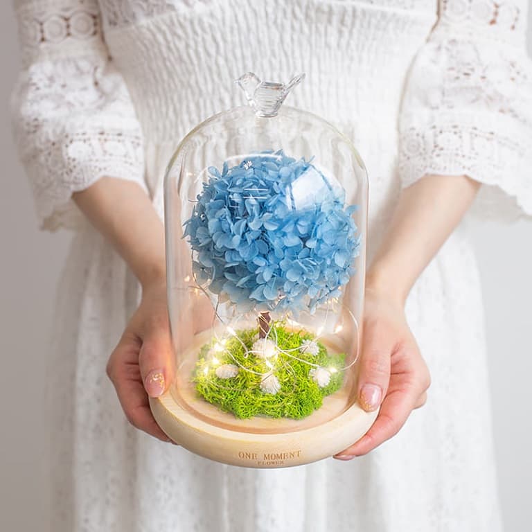 투명한 유리돔 안 블루 수국에 은은한 빛을 담은 모습은