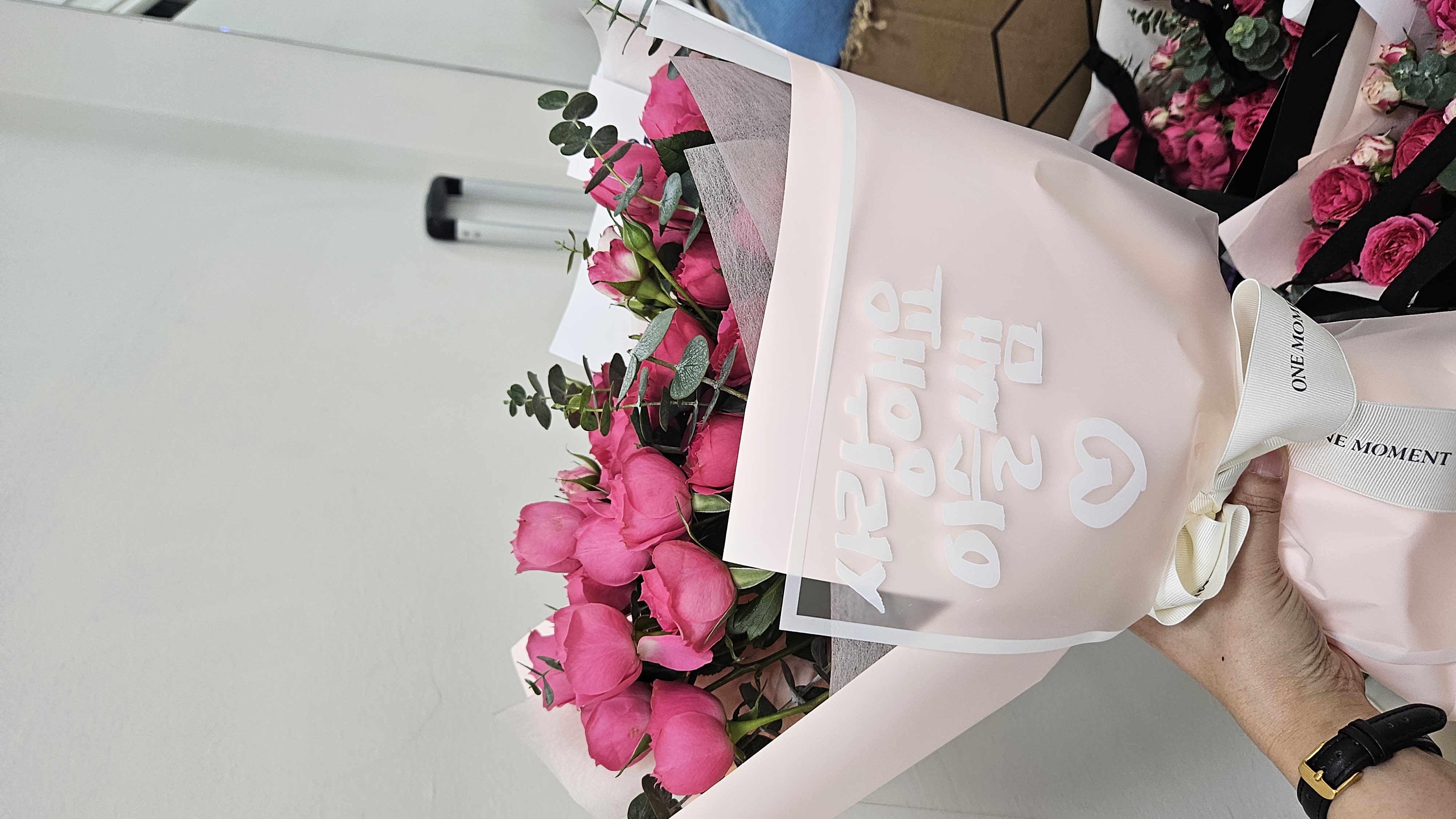 주요 구성: 스프레이장미(핫핑크) / 구니 / 맞춤 레터링문구