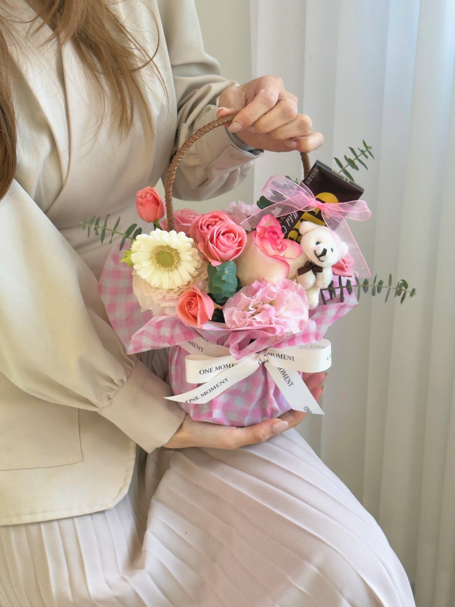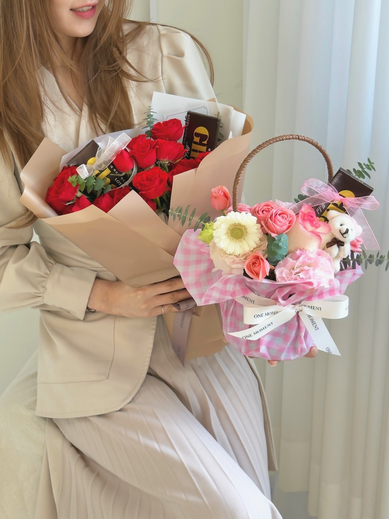 꽃과 함께 초콜릿, 미니 테디베어를 더해