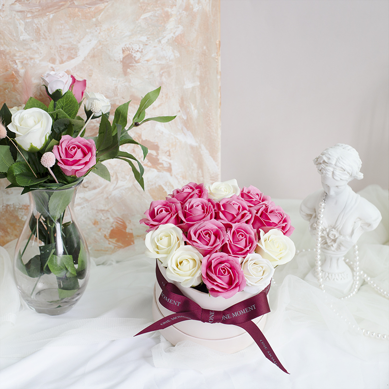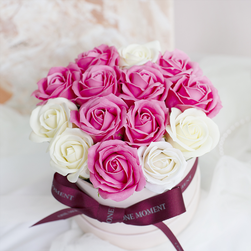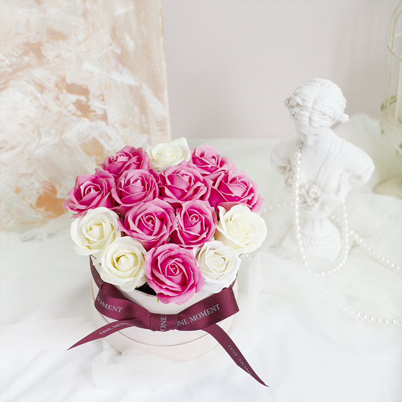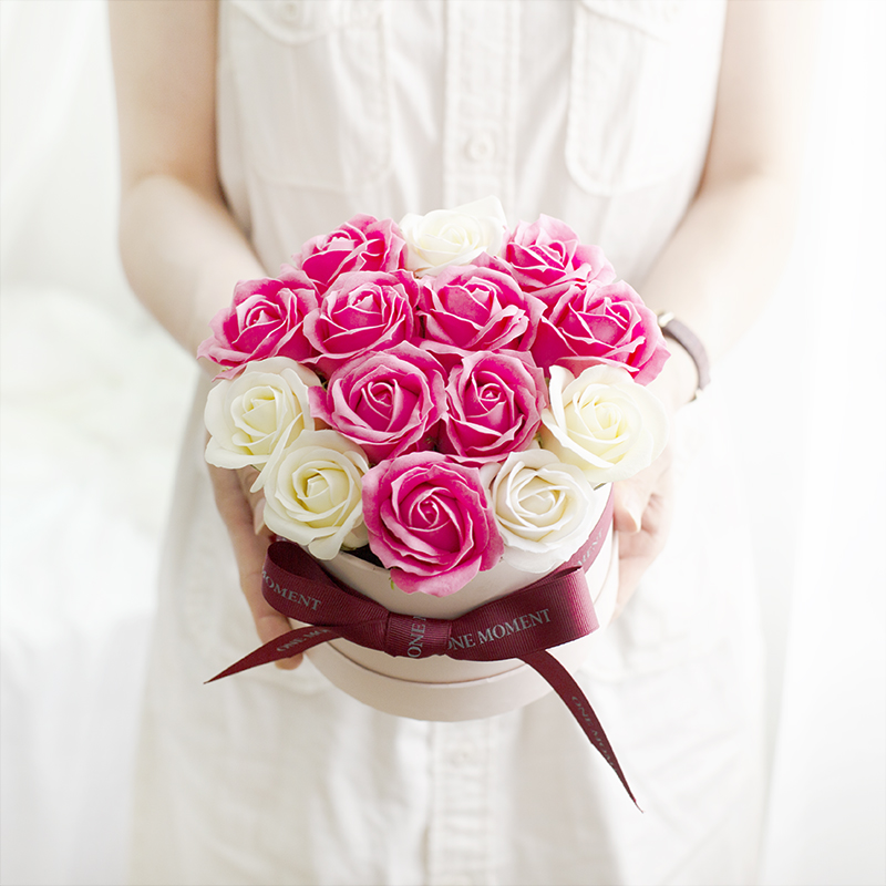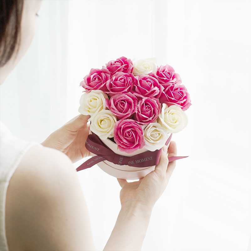 '행복한 사랑'의 꽃말을 담은 핑크 로즈를 비누로 만든 꽃다발이에요.