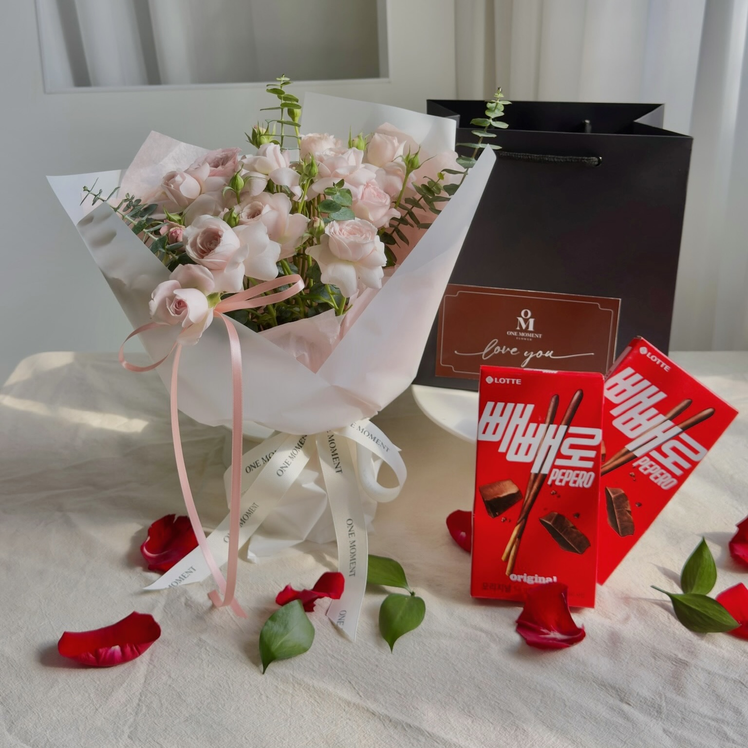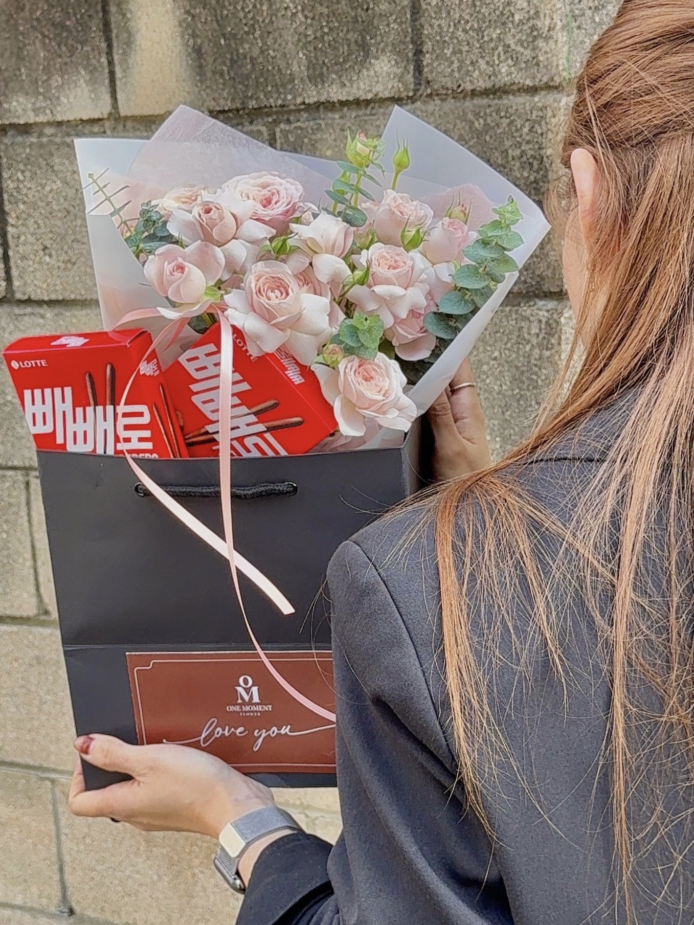 생화꽃다발 + 빼빼로 + 쇼핑백 세트로