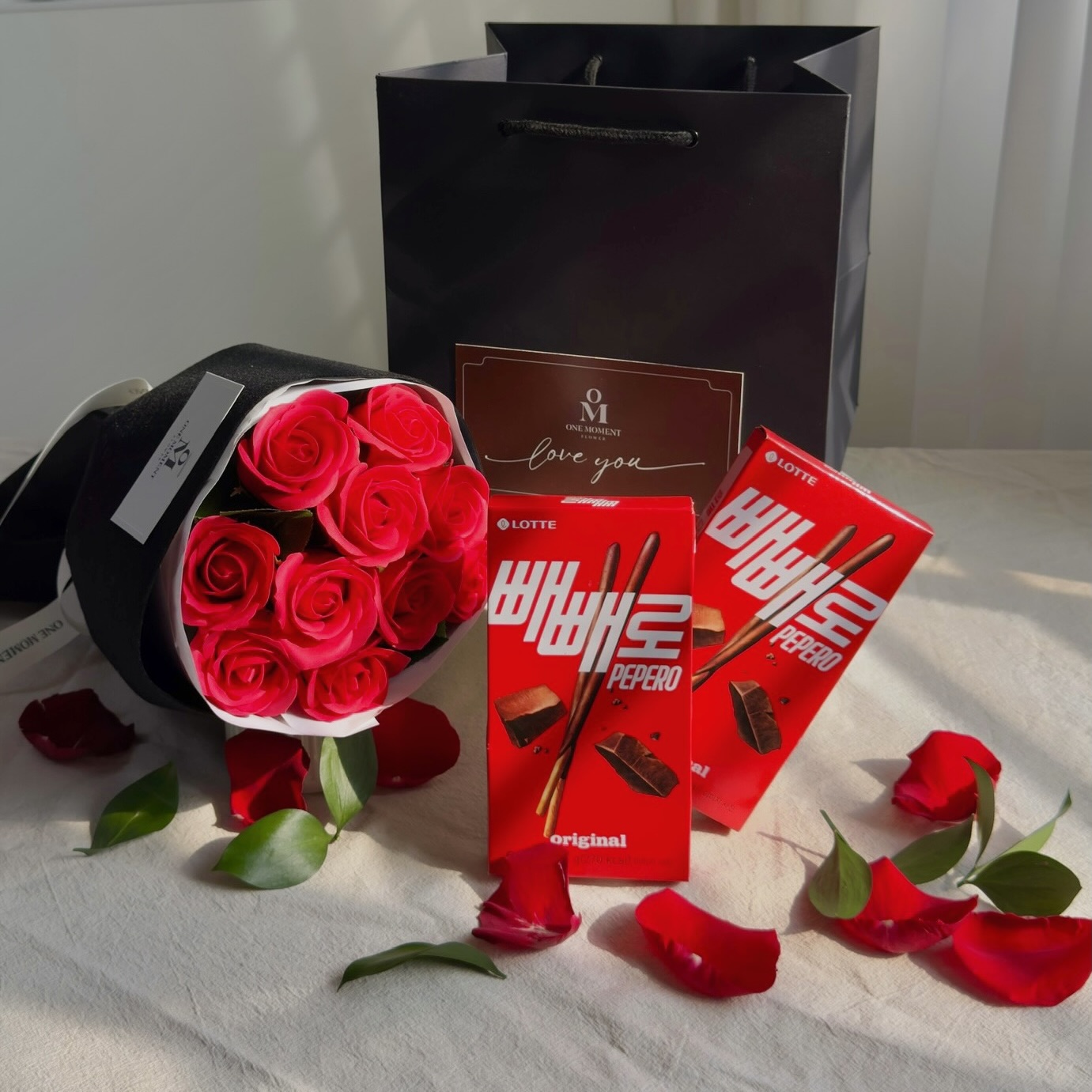 생화꽃다발 + 빼빼로 + 쇼핑백 세트로